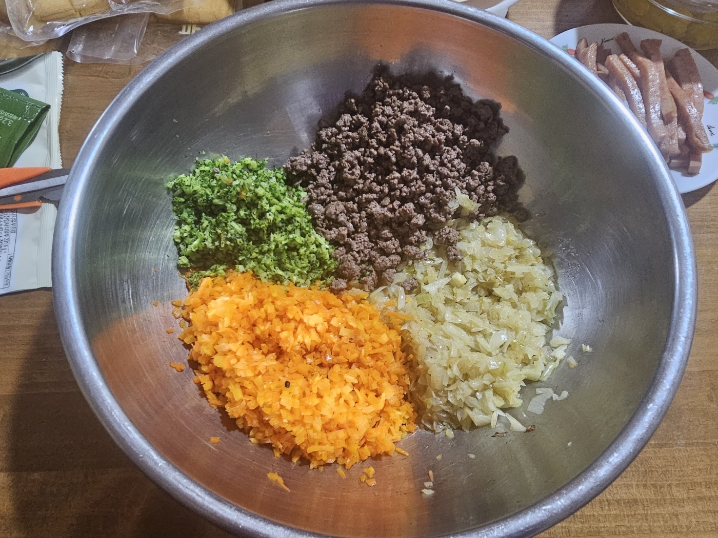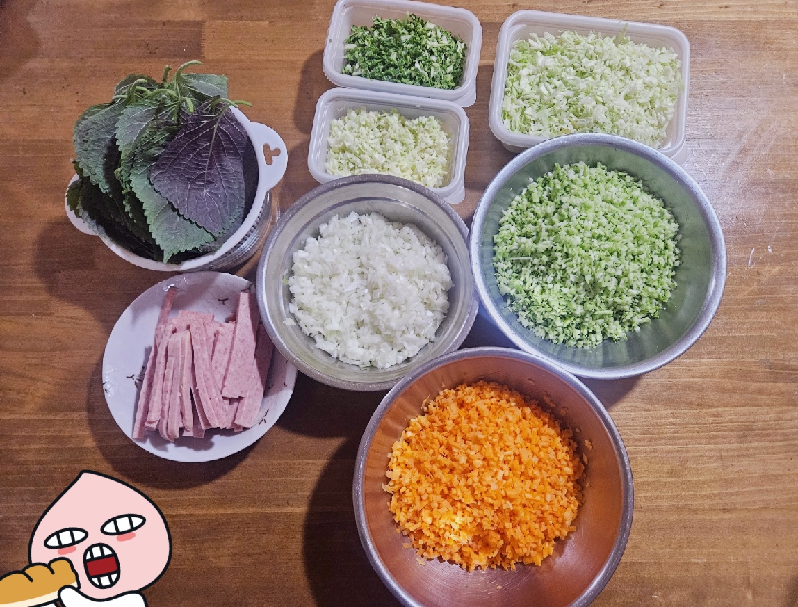 저녁 10시부터 썰고, 다지고, 볶고 식히고 정신없는 준비과정